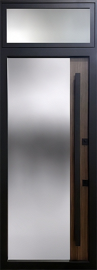 Уличная термодверь с остекленной фрамугой, двухцветными панелями МДФ, бугельными ручками и зеркалом внутри КД-1109